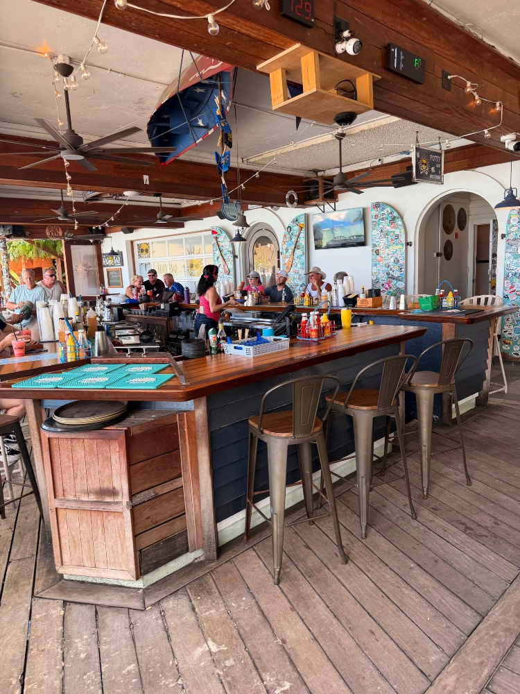 The menu is pretty standard, offering breakfast in the morning, giving way to traditional beach fare after 11 am. The cocktails are delicious, and while I’m not much for frozen drinks, I can tell you that they are pretty darn tasty. Lucky for me I was sitting right in front of the prep area for one of the bartenders, and she — obviously, someone who hated to waste — was kind enough to have me taste all the leftovers. I may have been the easiest bartender shift of her career. Talk about a willing audience.