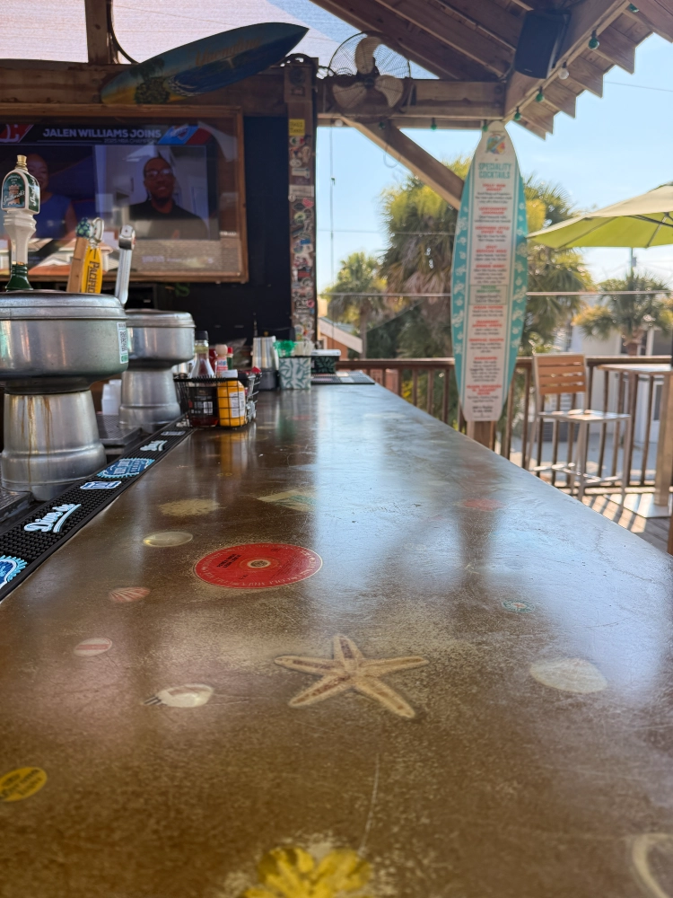 The bar top is mesmerizing – it’s an epoxy top that encases sand, bottle caps, bikini tops, shards of beer bottles and other beach shrapnel in it. Bonus points for such a beachy vibe!