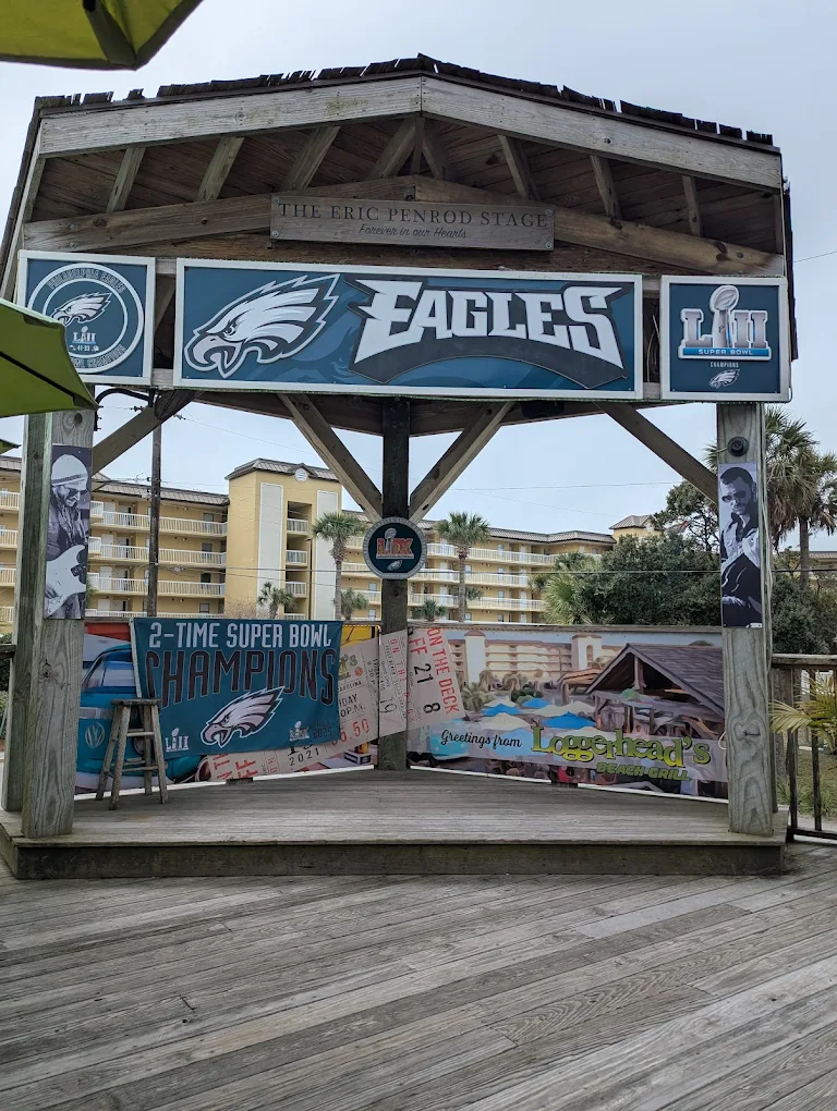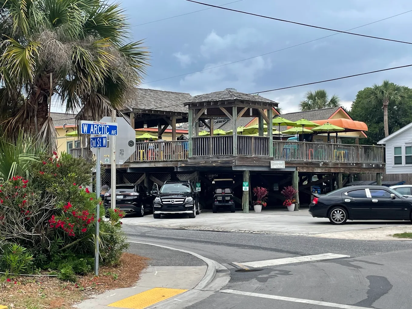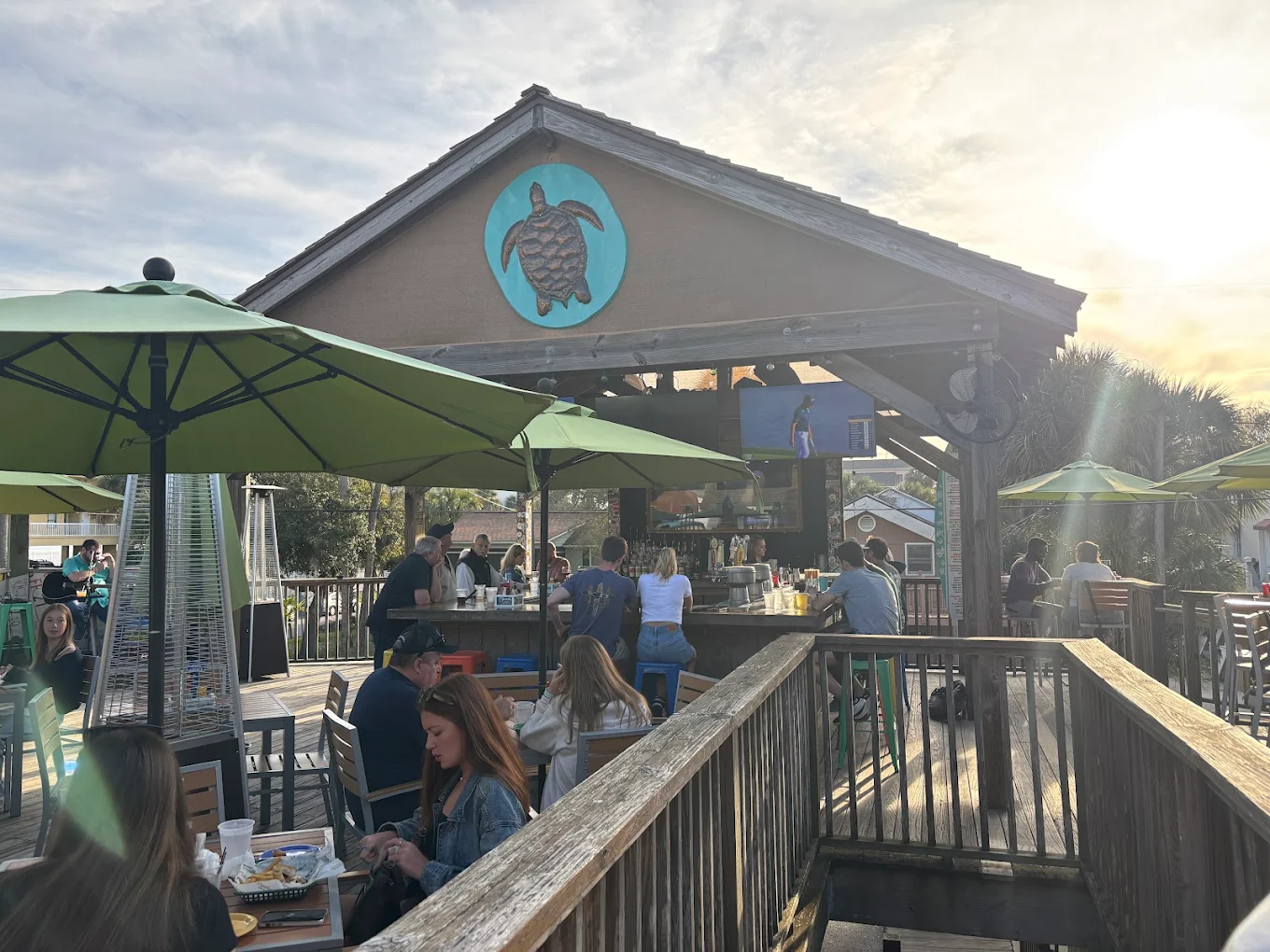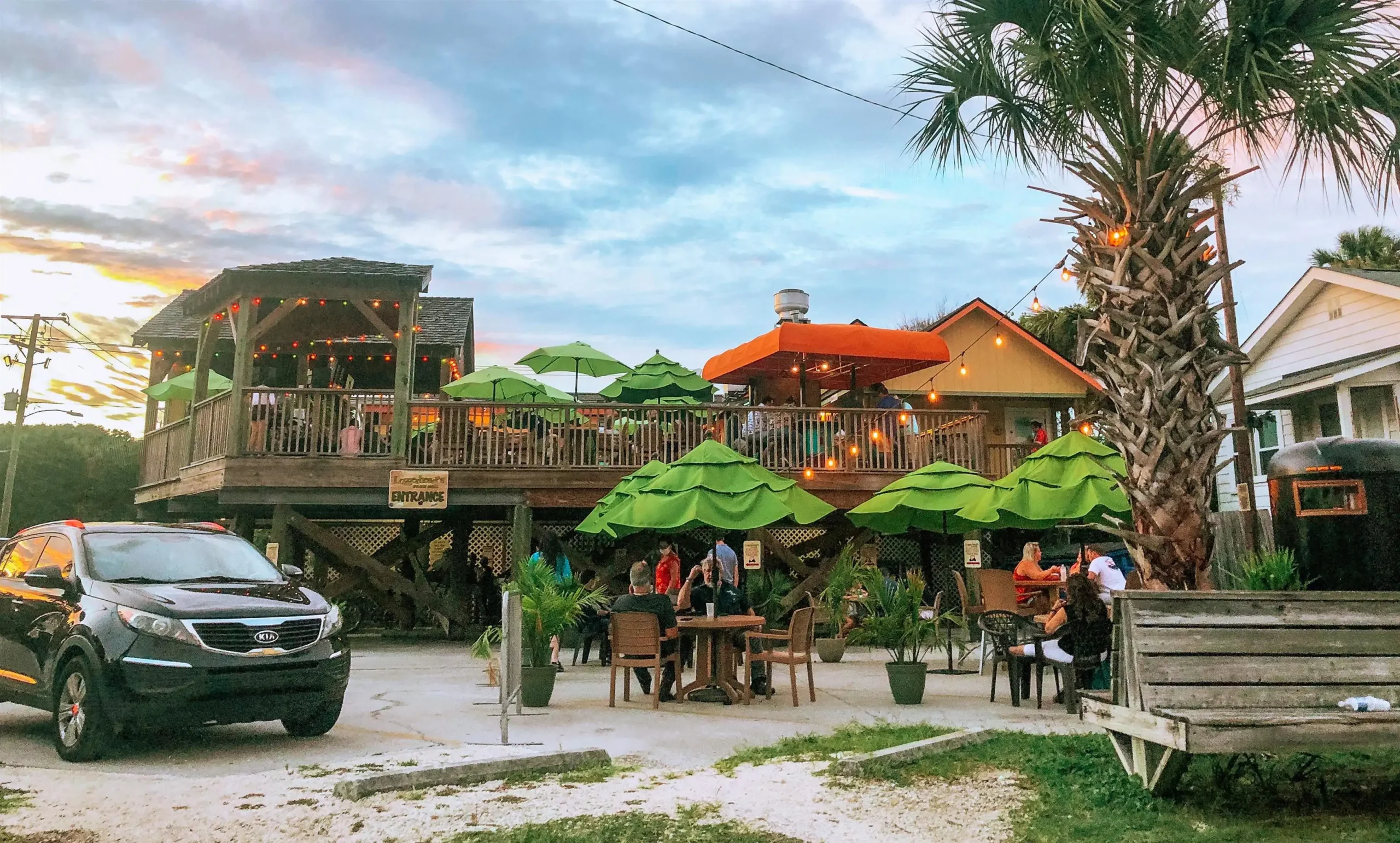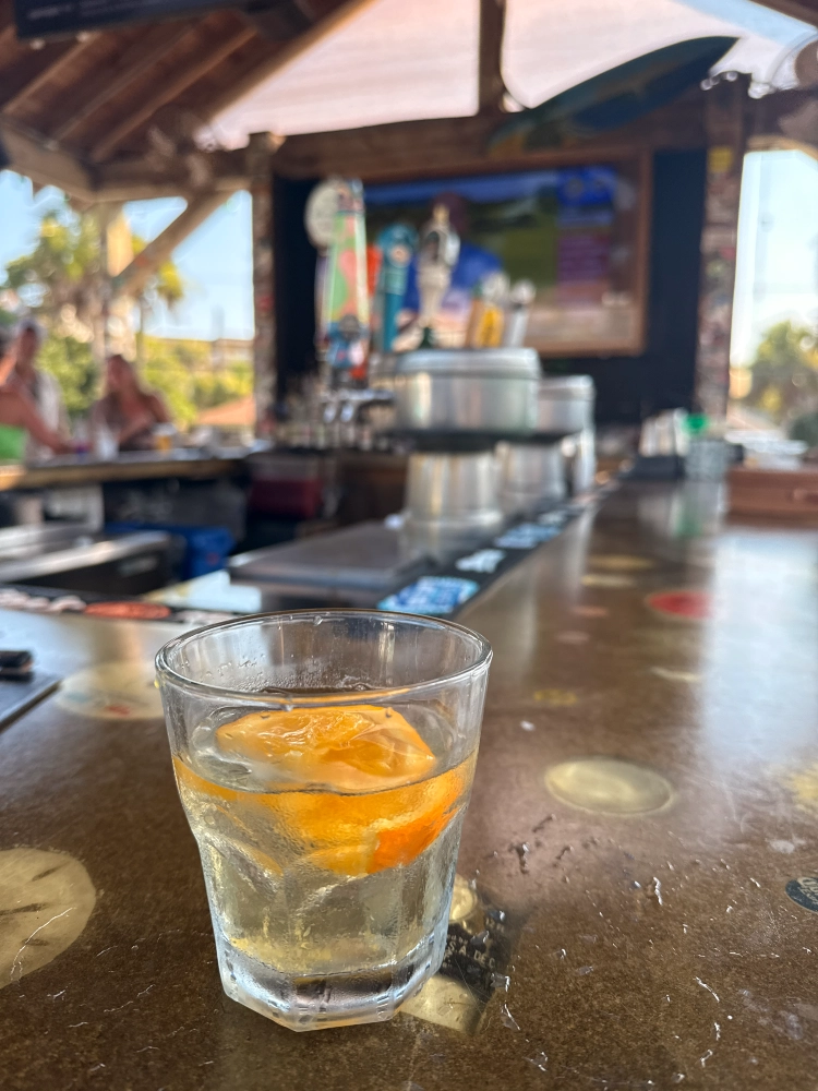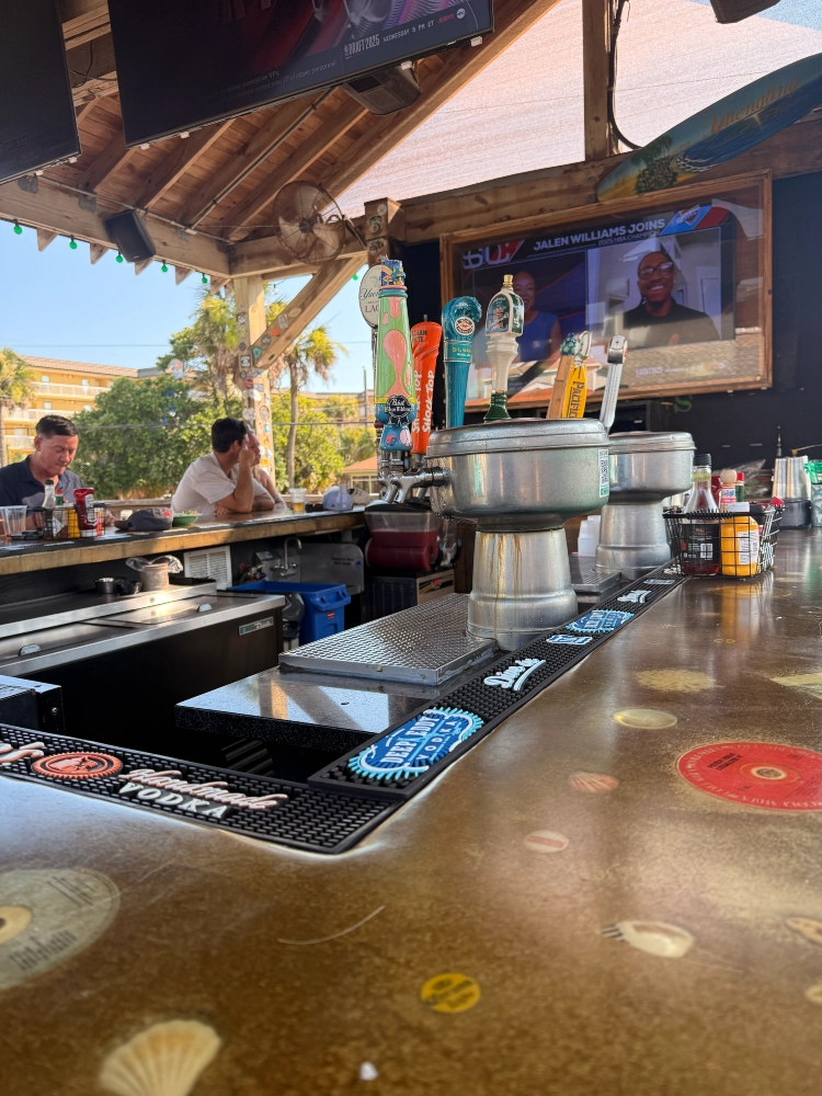 Loggerhead’s is a proper beach bar through and through — just don’t expect sweeping ocean views. Parked across from a condo building with an open ground-level lot, you catch only teasing glimpses of sand and surf through the gaps. But the salt air is real, the vibe is right, and a vintage VW pickup converted into seating sits at the heart of it all. It’s a beach bar setting that earns its stripes.