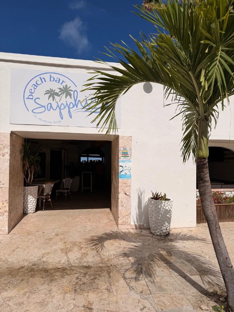 Located on Sapphire Beach on the Northeastern side of St. Thomas, Sapphire Beach Bar is on the sand, sandwiched between a condo complex of the same name and a smaller, older resort known as Crystal Cove. There’s plenty of parking, but there is typically a person in the guard shack out front. Don’t let that dissuade you; just let them know you’re there to partake in the bar. Parking is on the left and there is also a taxi shack out front for the smart people that catch rides.